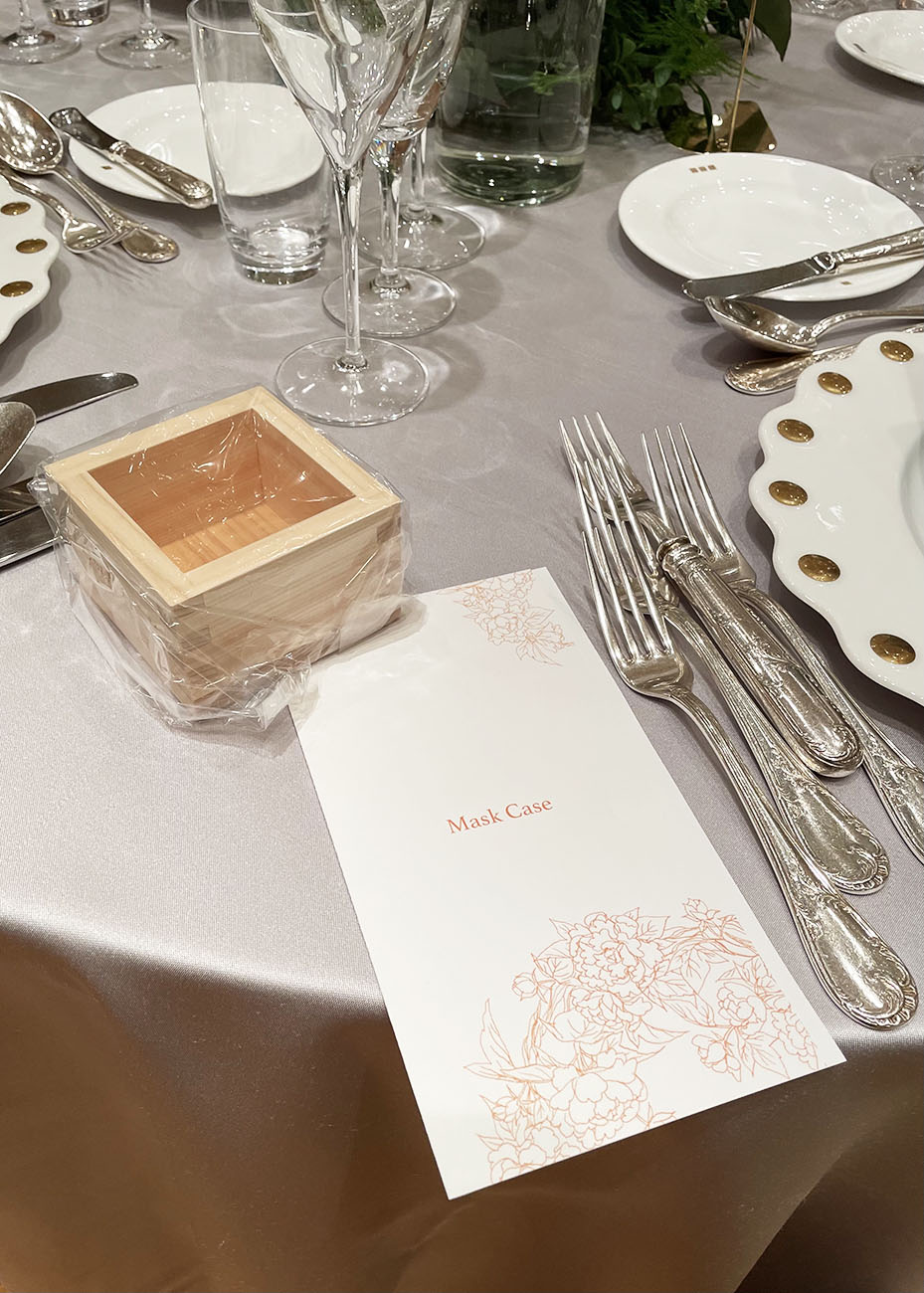 鏡開きでの乾杯だったので、ゲストの皆様用のマスはあえて透明の袋に入れたままセットし、